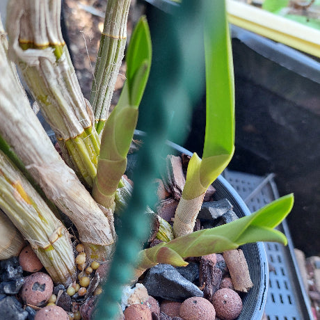 Premium top notch orchid division, this is the 2nd one Ive made available the first one went in no time!! Dendrobium Avrils Gold 'Measles' rarely seen a very nice orchid clean as whistle, 6 active canes and 4 new ones coming through, been in this pot for about 12months but when you get the new canes coming through you know its doing well, pic of flower is this exact plant, its a compact grower, some of the Avrils get a bit leggy and this orchid produces nice long spikes with a very nice flower, a real stunner, freights a bit expensive but this is a big plant, just remember you pay no more than $35 freight on your total order and if by chance the freight is less Ill send you a refund, so load up you carts!