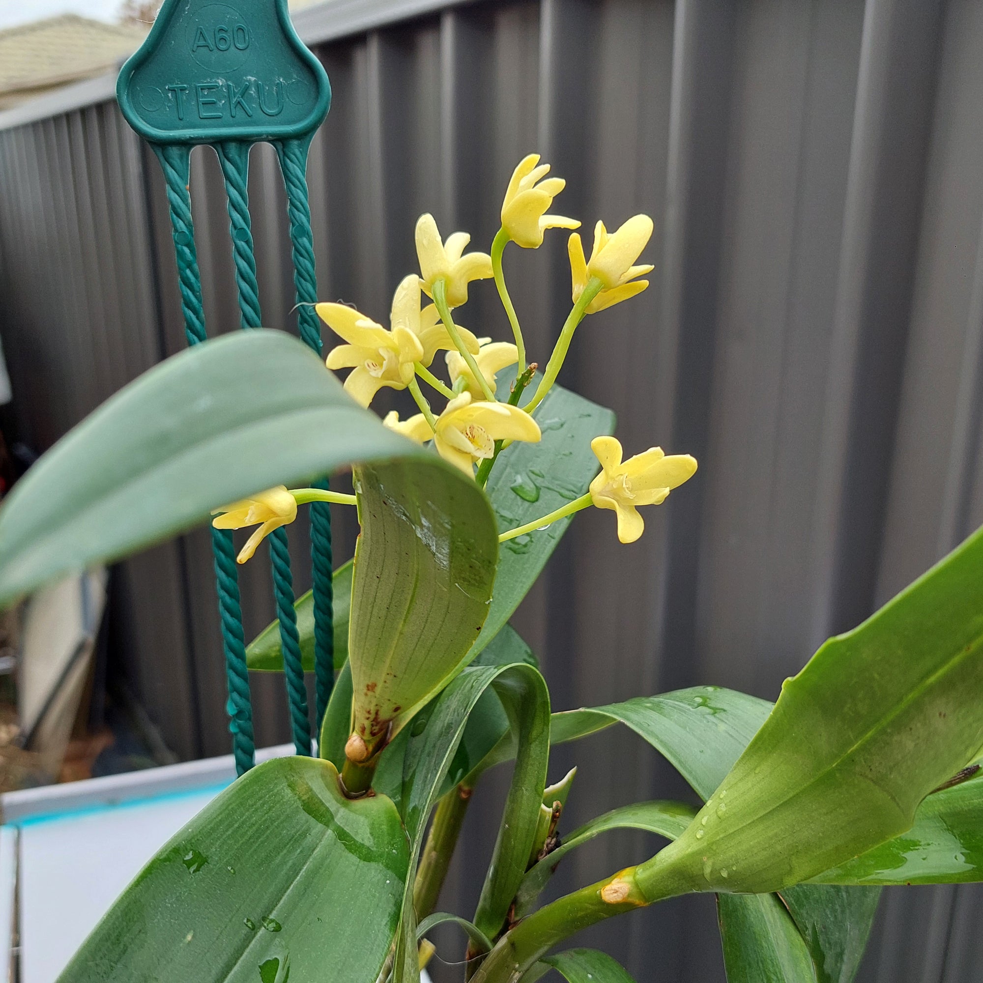 A very nice big division new growth well established, Dendrobium Gracillimum = Den. Gracilicaule 'Sids Gold Perfection' x Den. Spec. Intervarietal "Herbmere Lemonade' gorgeous little flower, I have a few of these and once they get big they are stunning, cold doesn't seem to worry them either, freight is a bit expensive but this is a reasonably big plant